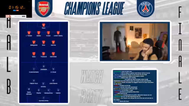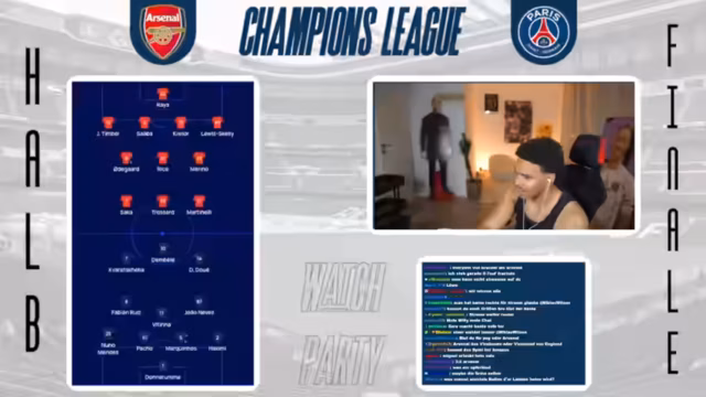 02:45:04Während des Live-Streams wird ein Fußballspiel zwischen PSG und Arsenal gezeigt und live kommentiert. Der Streamer analysiert das Spiel intensiv, lobt PSGs starkes Kollektivspiel und Pressing, äußert sich zu taktischen Aspekten und kritisiert Uneffektivität von Arsenal im letzten Drittel. Er unterbricht die Analyse jedoch häufig, um technische Probleme mit der Darstellung des Spiels und der Einblendung einer Uhr zu lösen, was den Zuschauern missfällt.