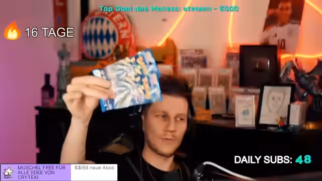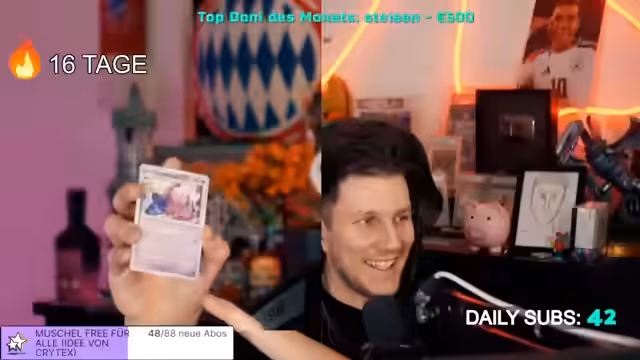 00:11:58Aufgrund einer persönlichen Sucht nach Pokémon-Boosterpacks führt der Streamer eine neue Regel ein: Für jede 5er-Subbombe, eine Spende oder eine gleichwertige Menge an Bits gibt es ein Boosterpack als kleine Aufmerksamkeit. Dies ist als kleines Dankeschön an die Community gedacht und soll dazu dienen, den Vorrat an Packungen abzubauen. Der Streamer betont, dass es sich nicht um eine Belohnung für Spenden handelt, sondern um eine Geste der Wertschätzung.