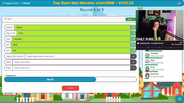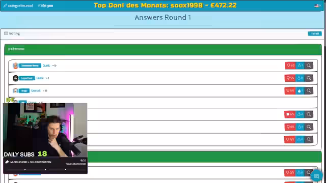 01:43:32Die zweite Runde des Spiels beginnt mit dem Buchstaben 'K'. Sofort entstehen Schwierigkeiten bei den Kategorien 'Fluss' und 'Marke' mit 'K'. Bei den Pokémon werden 'Karpador', 'Kanimani', 'Knuffensack' und 'Kingler' genannt, wobei 'Kanimani' als starker Eintrag hervorgehoben wird. Bei den League-Charakteren gibt es Einträge wie 'Kama', 'Kathos', 'Kalista', 'Kasadin' und 'Kali', aber auch 'Karius', was zu Verwirrung und Gelächter führt. Bei den Städten werden 'Karlsruhe', 'Kaiserslautern' und 'Krefeld' genannt, wobei es zu einer Diskussion kommt, da 'Köln' doppelt eingetragen wurde und der Streamer um Fairness bei der Bewertung bittet. Bei den Ländern werden 'Kasachstan', 'Kenia' und 'Kolumbien' genannt. Bei den Flüssen werden 'Kinzig' und 'Kongo' diskutiert, wobei der Kongo als bekannter Fluss akzeptiert wird. Die Kategorie 'tollpatschige Situation' führt zu weiteren humorvollen Einträgen wie 'Kackreiz' und 'Krustenarsch'. Bei den Marken werden 'Kia', 'Kraft' und 'Krombacher' genannt, wobei 'Kerastase' als Luxus-Haarpflegemarke für Diskussion sorgt. Die Runde zeigt erneut die Herausforderungen und den Spaß, den das Spiel mit sich bringt, sowie die Notwendigkeit, Regeln klar zu definieren und durchzusetzen.