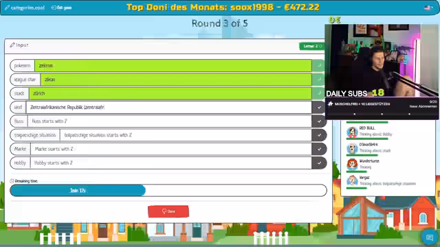 01:53:41Die dritte Runde des Spiels beginnt mit dem Buchstaben 'Z'. Der Streamer erlaubt das Googeln von Namen, wenn man den Namen bereits kennt, aber nicht, um neue Wörter zu finden. Die Kategorie 'Land mit Z' wird als einfach empfunden, während 'Fluss mit Z' als besonders schwierig gilt. Der Streamer vermutet, dass jeder, der einen Fluss mit 'Z' einträgt, diesen gegoogelt haben muss. Die Zeit läuft ab, und bei den Pokémon werden 'Zickzacks', 'Zapdos', 'Zickrum' und 'Zubat' genannt, wobei 'Zickzacks' und 'Zapdos' als bekannt gelten. 'Zigimon' wird als nicht existent identifiziert und mit 'Digimon' verwechselt. Bei den Flüssen wird 'Zickzackfluss' erwähnt, was zu einem klaren Vorteil für einen Teilnehmer führen könnte, der die lokalen Gegebenheiten kennt. Die Runde endet mit der Erkenntnis, dass bestimmte Kategorien und Buchstaben zu erheblichen Schwierigkeiten führen können und dass ein gewisses Allgemeinwissen oder ein schneller Google-Check erforderlich sein kann, um Punkte zu erzielen. Die Diskussionen über die Gültigkeit der Einträge bleiben ein zentraler Bestandteil des Spiels.