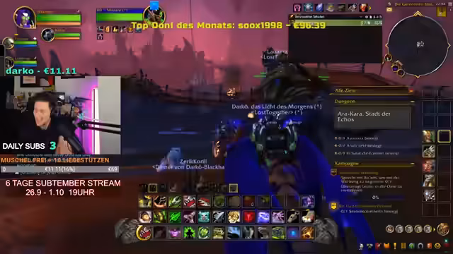 03:10:49Nach längerer Unterhaltung meldet der Streamer die aktuelle Situation für den Raid zurück. Er bestätigt, dass die Gruppe fast komplett ist und Pascal, der zuvor auf Discord beschäftigt war, nun auch dabei ist. Als positive Neuheit verkündet er, dass Darko einen High-Dungeon-Raid bereits erfolgreich im Alleingang absolviert hat und sogar das zugehörige Mount erhalten hat, was den Leiter des Teams beeindruckt.