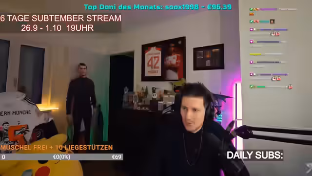 00:00:41Der Stream beginnt mit einer lockeren Begrüssung der Zuschauer. Der Streamer erwähnt seine Erkältung und wechselt das Thema schnell zur Ankündigung des grossen Events am 26. September. Dieses Datum steht im Fokus des Streams, und es wird versprochen, spätestens ab dem 69. Tag Details zum Inhalt des Events zu verraten. Die Stimmung ist gelassen, und es besteht der Hinweis, dass die Chat-Interaktion zur Zeit noch etwas ruhig ist.