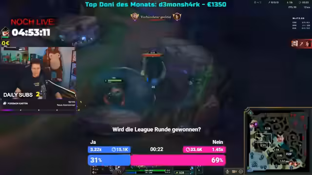 04:34:31Im Mittelpunkt des Streams stehen die Kommentare zu aktuellen League of Legends-Spielen. Der Streamer analysiert das Spielverhalten seiner Mitspieler und gegnerischen Champions, wie den aggressiven Garen und den problematischen Nocturne. Er äußert Frustration über das Verhalten seines Teams, insbesondere die reinen Push-Strategien und das Fehlen von taktischem Denken. Besonders kritisiert er die mangelnde Teamkommunikation und das Fehlen von Gehirnspiel, was zu verlorenen Spielen und einem emotionalen Abstieg in der Liga führt. Die Spielszene ist geprägt von intensiven Gank-Versuchen, erfolgreichen Stuns und letztendlich unglücklich verlorenen Teamkämpfen.