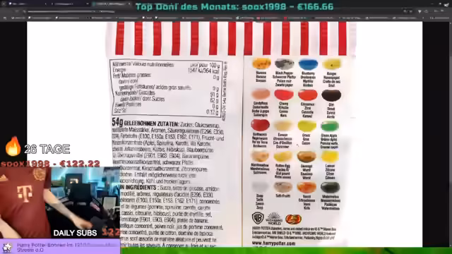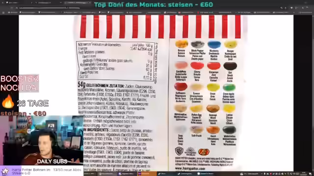 02:27:24Der Stream kehrt zu den Harry-Bohnen zurück. Es wird beschrieben, wie der Pot gefüllt wird und welche ekeligen Sorten wie 'Regenwurm' oder 'faules Ei' sich darin befinden. Streamer und Chat tauschen sich über Geschmackserwartungen aus. Gleichzeitig wird eine Aktion für Subs angekündigt, bei der für eine bestimmte Anzahl von Abonnements weitere Pokémon-Booster verlost werden.