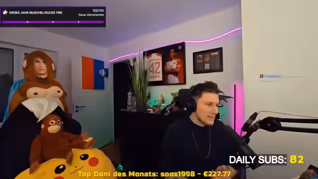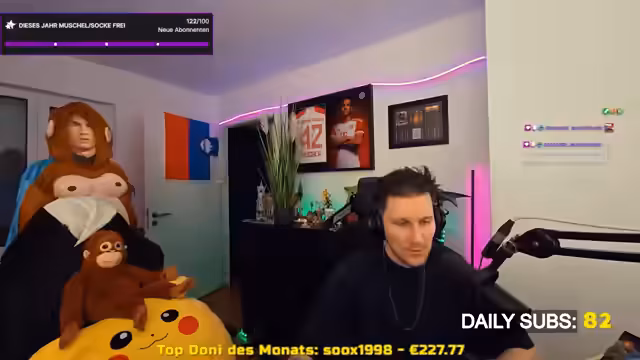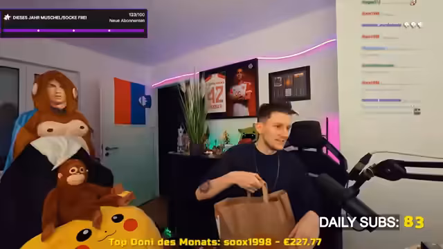02:37:44Nilo zeigt und bespricht seine Weihnachtsgeschenke, darunter Popcorn, Süßigkeiten und ein Kinder-Joy-Ei, in dem ein Dustin-Spielzeug war. Er ist aufgeregt darüber und teilt seine Freude mit der Community. Er erinnert an die Möglichkeit, ihn über Twitch Prime zu unterstützen, und kündigt die Stranger Things Watch Party um 22 Uhr an. Er spricht auch über das Finderlohn (20 Euro) und dass zwei Freunde je 5 Euro gefunden haben, was er als crazy bezeichnet. Im Zusammenhang mit Geschenken erwähnt er vorsichtig, dass er zwar Postfach hat, aber Bedenken wegen möglicher negativer Reaktionen wie Polizeieinsätzen oder Bestellungen hat.