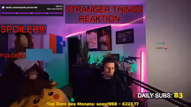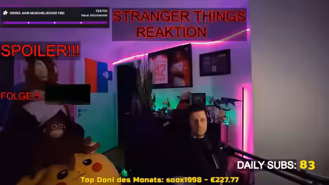 03:41:05Mit dem Start von Folge 5 kommentiert der Streamer live die Handlung und reagiert auf Schlüsselszenen mit den Charakteren wie Eleven und Mike. Er bietet regelmäßige Zeit-Anzeigen an, damit Zuschauer synchron bleiben können, und deutet Pausen an, falls Unterbrechungen benötigt werden. Währenddessen interagiert er mit dem Chat, ohne technische Probleme oder Spendenvorgänge zu erwähnen.