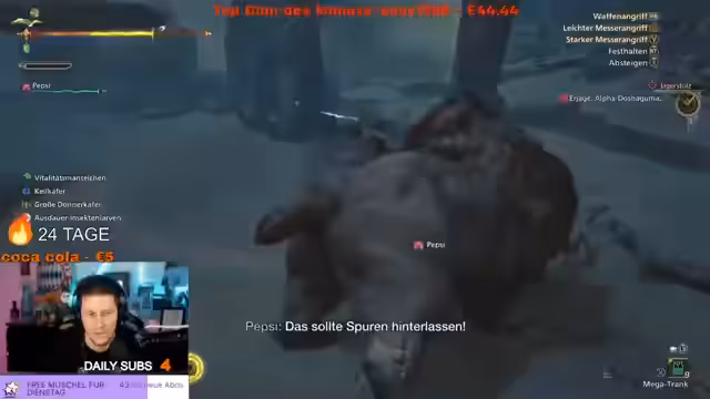 00:16:43Die erste Stunde widmet sich dem Spiel Monster Hunter Wilds. Der Streamer beeindruckt von den hohen Verkaufszahlen, die den Rekord von Elden Ring gebrochen haben. Er äußert sich sehr positiv über das grafische und spieltechnische Niveau des Spiels und beginnt mit dem Gameplay, bei dem er verschiedene Monster bekämpft und erste Missionen absolviert.