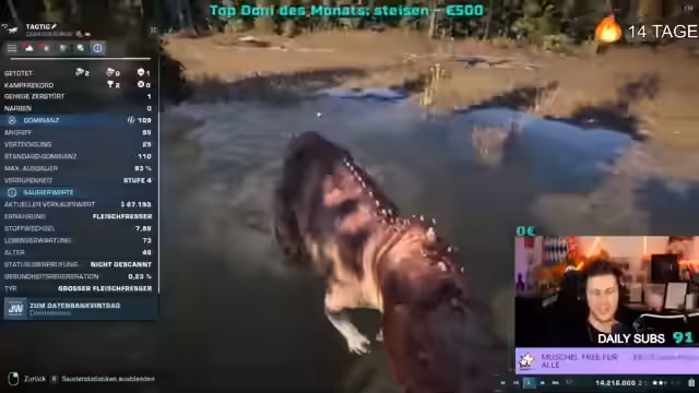 05:14:23Im Stream wird die Verwaltung eines Dino-Parks thematisiert. Der Streamer nutzt die Kartenansicht, um sich die Verteilung der Tiere anzeigen zu lassen, und diskutiert die Koabitation verschiedener Spezies, wobei er darauf hinweist, dass sich Fleischfresser im selben Gehege bekämpfen können. Es werden Dinos wie Taktik und Steisen eingeführt, deren Daten wie Dominanz und Lebenserwartung erörtert werden. Die Jagd und das Fressverhalten der Tiere werden beobachtet und kommentiert, was zu chaotischen Situationen im Park führt.
