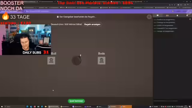 08:15:32Ein Höhepunkt des Streams ist ein gemeinsames Spiel, das mit der Community im Chat gespielt wird. Die Regeln sind komplex: Teilnehmer müssen aus vorgegebenen Buchstaben Silben bilden und passende Wörter finden. Der Streamer interagiert intensiv mit den Spielern, lobt schnelle Wortfindungen und stellt fest, dass Teilnehmer wie 'Bodo' besonders talentiert im Spiel sind. Es herrscht eine konkurrierende, aber zugleich amüsierende Atmosphäre, die die Beteiligung der Community fördert.