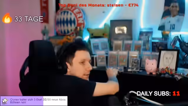 08:10:28Der Streamer zeigt und spricht über seine Pokémon-Kartensammlung, die er ursprünglich komplett besessen hat, aber größtenteils für sein PC-Setup verkauft hat. Er stellt seine teuerste Karte vor, eine limitierte Autogrammkarte von Cristiano Ronaldo, die ihn über 1000 Euro wert sein soll und auf die er bereits fast ein Jahr wartet. Diese Aussage unterstreicht seine Leidenschaft für Sammlerstücke und seine Enttäuschung über die lange Wartezeit auf das versprochene Exemplar.