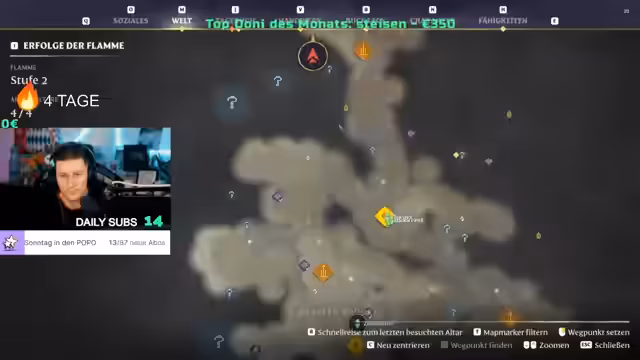 02:45:27Zu Beginn beschäftigt sich der Streamer mit dem Farmen von Ressourcen im Spiel, insbesondere mit dem Abbau von Kamillen, die für Heilzauber benötigt werden. Dabei wird die Möglichkeit, Haselnüsse zu finden, erwähnt, deren Anbau jedoch zunächst unklar ist. Gleichzeitig wird die Arbeit am Ausbau der Basis vorangetrieben, wobei das Auffinden und Platzieren von Truhen sowie die Fortschritte in den verschiedenen Spielbereichen wie Alchemie und Crafting im Vordergrund stehen. Es werden mehrere Rohstoffe wie Eisen, Bretter und Salz gesammelt, um in der Basis weiterbauen und verbessern zu können.
