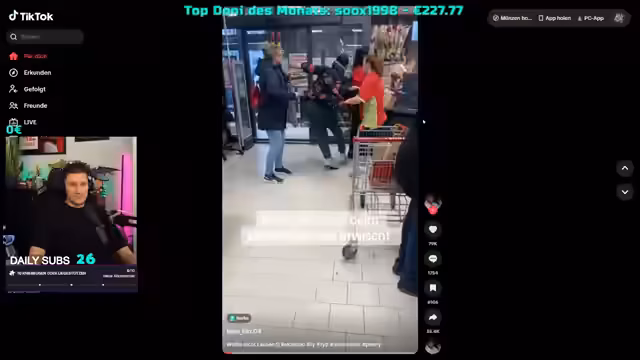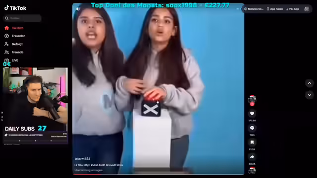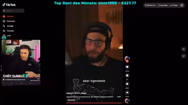 05:23:15Der Streamer betritt die TikTok-Plattform und zeigt eine Auswahl an Videos. Im Vorwege weist er explizit darauf hin, dass es sich um einen separaten, nur für den Stream erstellten Account handelt und er keinerlei Verbindung zu privaten Inhalten hat. Es folgen verschiedene virale Clips, darunter ein kontroverses Video über eine vermeintliche Wasser-Verdampfungs-Technik und ein Bauplan für einen 'Apartmentkomplex' in Apex Legends.