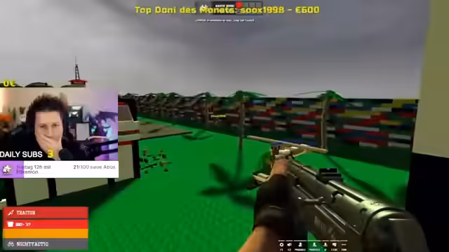 01:55:10Eine längere Gaming-Sitzung wird mit den Teilnehmern Darko, Luma und Taktik gespielt. Es geht hauptsächlich um das Spiel Gary's Mod, in dem die Teilnehmer verschiedene Rollen wie Innocent, Traitor und Detective einnehmen. Der Streamer diskutiert über Spielstrategien wie das Tarnen, das Platzieren von Fallen und das Identifizieren von Gegnern. Es gibt auch Diskussionen über Waffen, Munition und spezielle Fähigkeiten, die im Spiel verwendet werden.