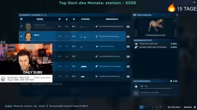 00:49:09Die Aufmerksamkeit verlagert sich auf das Spiel Jurassic World Evolution. Der Streamer zeigt den Fortschritt im eigenen Dino-Park, einschließlich der erfolgreichen Forschung und Zucht eines Tyrannosaurus Rex. Er erklärt die Haltung und Bedürfnisse der Dinos. Trotz großer Investitionen verlieren die gezüchteten T-Rexe in Kämpfen gegen andere Raubtiere, was den Streamer überrascht und frustriiert.