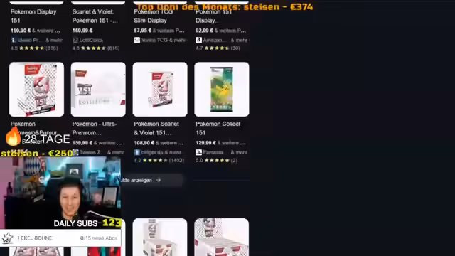 03:42:13Es wird eine große Anzahl von Boosterpacks aus Pokémon-Karten geöffnet. Zunächst äußert der Streamer Unzufriedenheit mit dem Display, da nur wenige Alte und seltene Karten wie Arbok und Nela gezogen wurden. Viele der Karten gelten als wertlos oder nicht so schick, wie es erhofft wurde. Die Aussage ist, das Display sei 'scheiße' und 'Müll', obwohl er auch einigermaßen zufrieden ist, da er einige Karten für ca. 80 Euro verkaufen könnte. Trotz der Enttäuschung gibt es den Hinweis, dass einige Karten wie Gengar oder die Alt-Arts sehr wertvoll gewesen wären.