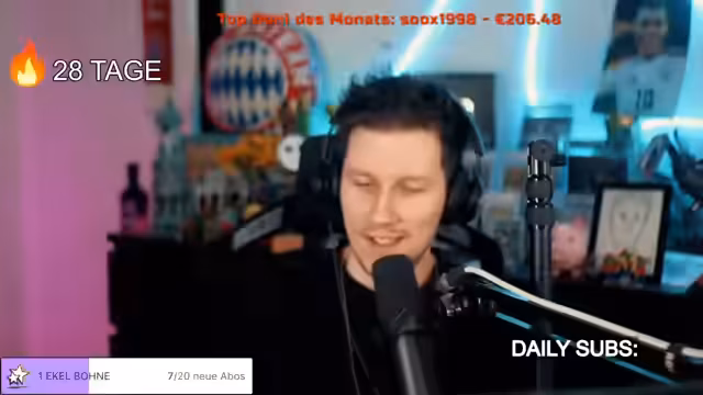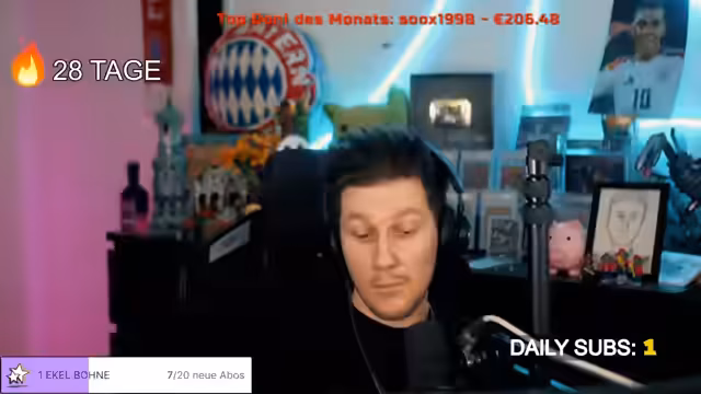 02:04:19Die Herausforderung eskaliert rapide, als der Streamer weiterhin Bohnen isst und dabei auf extrem widerliche Geschmäcker wie Kotze und Regenwurm trifft. Seine körperliche Reaktion ist stark; er spuckt aus, muss sich übergeben und zeigt panische Angst vor der nächsten Bohne. Der Chat interagiert stark, zählt mit und kommentiert die intensiven Reaktionen, was die Dramatik und die Überwindung des Streamers ins Zentrum rückt.