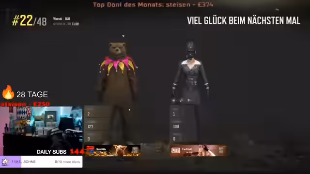 06:16:13Der Streamer kehrte zur Ekel-Bohnen-Challenge zurück und schüttelte die Bohnen. Er sprach über sein Unbehagen, das die Kisten verursachten, und erwähnte die Warnung vor verfalltem Ei als schlimmste Konsequenz. Er versuchte, die Kisten aufzumachen und äußerte seine Bedenken, dass der Geruch chemisch sei und widerlich rieche. Parallel dazu lief das Gameplay weiter, bei dem er eine Runde PUBG spielte, in der er mit einem Freund lootete, ein Auto fuhr und in Kämpfe verwickelt wurde, bei denen er mehrere Kills erzielte, aber auch selbst getroffen wurde.