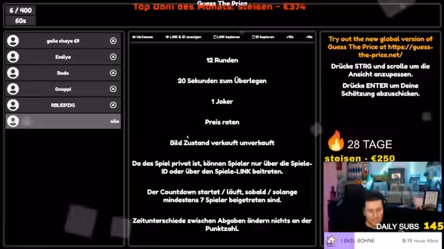 09:33:41Der Streamer initiiert ein interaktives Preisspiel, bei dem die Zuschauer den Preis von verschiedenen Artikeln raten müssen. Ein Teilnahme-Link wird bereitgestellt, und die Regeln werden erklärt: Es gibt 12 Runden, die Teilnehmer haben die Möglichkeit, einen Joker zu verwenden und müssen den geschätzten Preis von echten und fiktiven Produkten erraten. Der Streamer moderiert das Spiel und kommentiert die abwechslungsreichen und oft skurrilen Einreichungen der Chat-Teilnehmer.