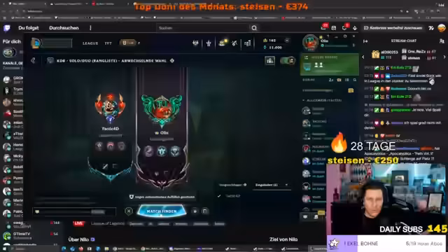 10:18:26Der Streamer sucht aktiv nach Mitspielern für diverse Spiele wie Rocket League, Monster Hunter oder Laia's Bar. Er ruft gezielt Namen von Chat-Mitgliedern, wie Taktik, Cebu oder Mihi, auf, um sie zum Mitmachen zu bewegen. Gleichzeitig laufen League of Legends-Spiele im Hintergrund, während der Streamer den Chat mit Kommentaren versorgt und versucht, die Zuschauer an der eigentlichen Aktion teilhaben zu lassen.