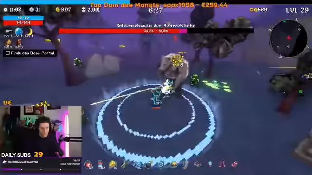 01:25:10Der Frust kehrt zurück, als der Streamer auf einen weiteren Boss namens 'Bolzenschwein der Schreckliche' trifft. Dieser entzieht ihm durch Angriffe einen Großteil seiner Lebenspunkte und er droht zu sterben. Die übermächtigen Gegner führen dazu, dass er denkt, die Herausforderung nicht bestehen zu können. Der Spielspaß wird durch die hohe Schwierigkeit und die Unfairness bestimmter Gegner getrübt.