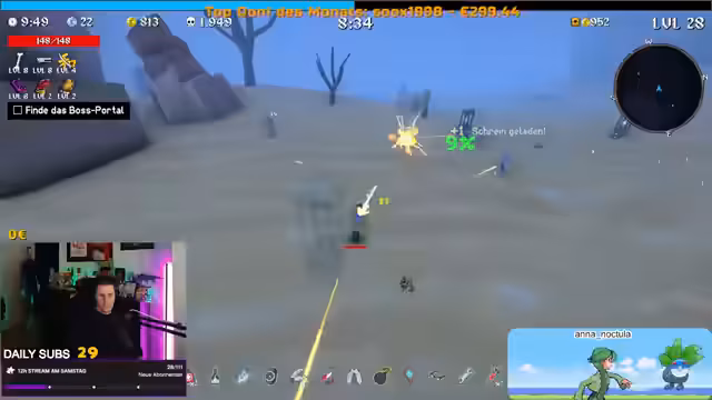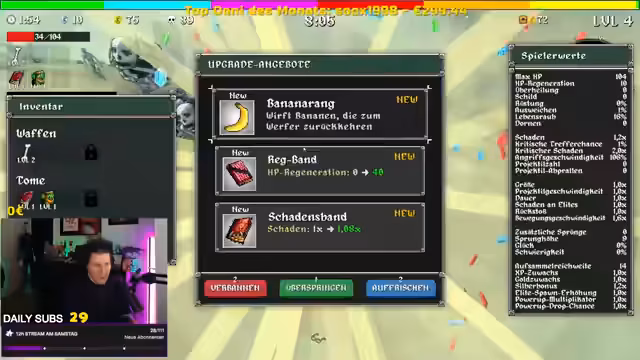 07:15:40Ein bemerkenswerter Moment im Gameplay von Megabonk, bei dem der Streamer eine Runde mit 99 Silber und einer immens hohen Anzahl von Bananen-Waffen spielt. Er beschreibt das Erlebnis als 'komplett gestört' und 'krank', da er fast unbesiegbar wirkt und riesige Schaden verursacht. Obwohl er keine legendären Gegenstände findet, ist der spielerische Aufwand und die Effektivität dieser Konfiguration bemerkenswert.
