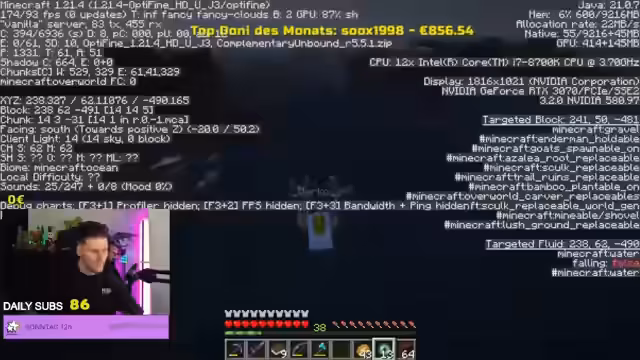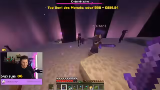 00:53:04Nach den Ankündigungen widmet sich der Streamer dem Abschluss eines Minecraft-Runs. Gemeinsam mit der Community werden die letzten Bosse besiegt: zunächst ein Widder, anschließend der Warden. Für den finalen Kampf gegen den Ender Dragon fehlen jedoch noch Ender-Perlen. Der Streamer versucht, diese durch Handel mit einem Dorfbewohner (Kleriker) zu beschaffen, was zu organisatorischen Schwierigkeiten und Verwirrung in der Koordination mit den Chat-Mitgliedern führt. Der Fokus liegt auf der Teamarbeit und der Bewältigung der technischen Herausforderungen des Spiels.