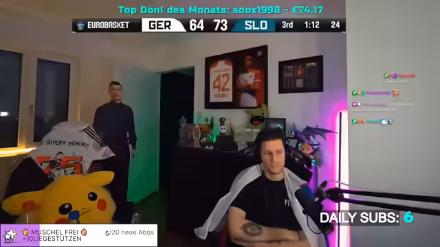 01:41:05Im Basketball-Spiel Slowenien gegen Deutschland kommentiert der Streamer intensiv die Spielzüge. Er beobachtet eine starke Offensive von Slowenien und kritisiert eine Entscheidung der Schiedsrichter, die er für falsch hält. Der Streamer sieht das Spiel als noch sehr offen an, solange der Punktestand niedrig ist und betont, dass beide Mannschaften noch unter keinerlei Druck stehen. Er äußert sich auch zu einem technischen Foul und erklärt die Regeln bei Freiwürfen, wobei er den Pfiff der Schiedsrichter als korrekt bestätigt.