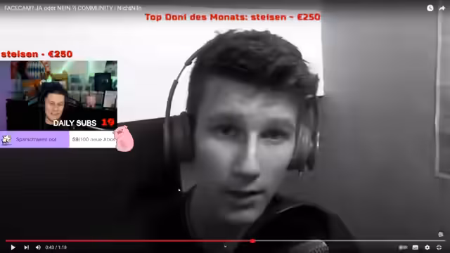 01:09:34Der Streamer schaut sich ein Video von vor neun Jahren an und kommentiert sein damaliges Aussehen und seinen Content. Er findet sein erstes Facecam-Video und erzählt von seinen damaligen Unsicherheiten bezüglich seines Aussehens. Er spricht offen darüber, dass er in seiner Jugend gemobbt wurde und sogar über eine Nasenoperation nachgedacht hat. Er erklärt, dass er im ersten Facecam-Video einen Schwarz-Weiß-Filter verwendete, da er Angst vor den Reaktionen auf sein Aussehen hatte. Er zeigt sein allererstes Video vom 20.06.2014 und erklärt, dass er damals von Simon (Unge) dazu ermutigt wurde, mit YouTube anzufangen. Er erinnert sich an die Anfänge mit Simon und wie dieser ihn unterstützt hat. Er erklärt die Entstehung seines Kanalnamens "nicht Nilo" und bedankt sich bei allen, die ihn unterstützt haben. Er erinnert sich an sein erstes Intro und bedankt sich bei den Intro-Machern.