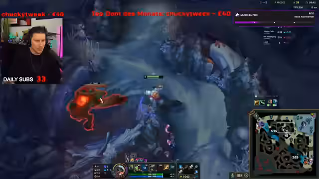 04:03:54Das League-of-Legends-Spiel gestaltet sich schwierig. Das Team des Streamers, insbesondere die Toplane, steht früh unter Druck. Der Streamer ist frustriert über den fehlenden Zusammenhalt des Teams und merkt an, dass er diese Champion-Combinationen nicht mehr sehen kann. Trotzdem kämpft er weiter und das Team beginnt, einen Vorteil zu erlangen, indem es erfolgreich einen Baron Nashor stiehlt und den Druck aufbaut.