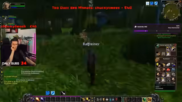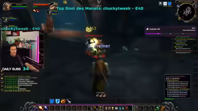 06:09:16Das Gameplay konzentriert sich auf das Leveln des Druiden in einer gefährlichen Allianz-Region. Die Gruppe kämpft gegen mehrere Gegner und es kommt zu Konflikten mit anderen Spielern, die als 'Ninja-Looter' bezeichnet werden. Der Streamer stellt seine Ausrüstung vor, eine Kettenhose und einen Stab, und diskutiert die Rolle der Gruppe im Kampf, bei der Pascal als Heiler vorgesehen ist. Gleichzeitig stellt der Streamer seine eigene Intelligenz als niedrig dar und fordert den Chat auf, Fragen zu beantworten.