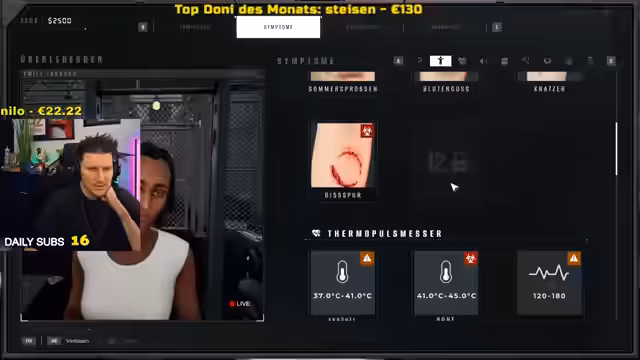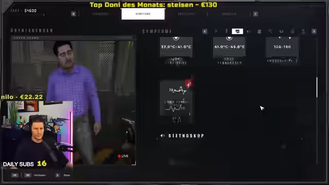 01:47:54Der Streamer nutzt im Spiel einen Thermopulsmesser, um Vitalzeichen der Überlebenden zu überprüfen. Er misst bei einem Charakter einen Puls von 178 und eine Temperatur von 40 Grad, was als eindeutig infiziert gilt. Daraufhin entscheidet er, die Person sofort in Quarantäne zu schicken, um eine weitere Ausbreitung der Seuche zu verhindern. Er erklärt die Bedeutungen der Symptome und die notwendigen Schritte zur Isolation, während er die Spielfigur durch die Quarantäne-Station führt, um die Maßnahmen zu überwachen.