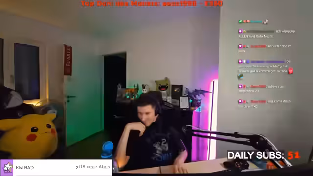 00:00:45Der Stream beginnt mit der Zeile 'Die Nacht ist lange nicht vorbei', was den nächtlichen Charakter der Sendung andeutet. Der Streamer berichtet über die hohen Temperaturen in seiner Wohnung und erwähnt, dass er im sechsten Stock wohnt, was im Sommer zu unerträglichen Hitzebedingungen führen kann. Nach der Begrüßung der Zuschauer werden persönliche Themen angesprochen: Der Streamer fühlt sich mental schlecht, hat aber Bock auf ein Rematch in einem Spiel, und es gibt eine Anspielung auf eine Rückzahlung des Finanzamtes über 150 Euro.