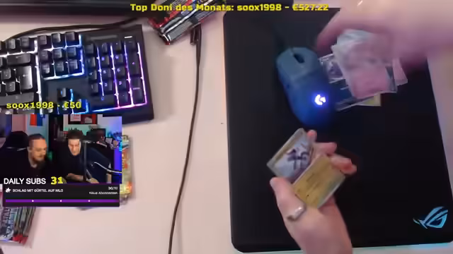 00:50:51Die Öffnung der Elite Trainer Box (ETB) erweist sich als weniger erfolgreich als erhofft. Trotz des Ratespiels um die Energiekarten, bei dem Nilo und Darko weiterhin daneben liegen, bleiben die großen Hits aus. Es werden zwar einige Holo-Karten und Pokémon wie Blitz, Plintha und Reshirama gezogen, aber keine der begehrten Full-Art- oder goldenen Glurak-Karten. Nilo äußert seine Frustration über das mangelnde Glück und stellt fest, dass Darko bisher die besseren Karten gezogen hat. Er scherzt, dass seine Hände 'Unglück' bringen. Nach der enttäuschenden ETB-Öffnung überlegen die Streamer, ob sie eine weitere Pokémon-Box öffnen sollen: eine große Glurak-Edition-Box. Diese Box enthält eine Glurak-Figur, Promo-Karten und zehn Booster-Packs aus verschiedenen Erweiterungen. Nilo erklärt, dass er die Box ursprünglich auf eBay verkaufen wollte, aber in Erwägung zieht, sie im Stream zu öffnen, wenn genügend Interesse und Unterstützung von den Zuschauern vorhanden ist. Er betont den fairen Preis der Box und die Möglichkeit, weitere seltene Karten zu ziehen, wie zum Beispiel Kiratina aus dem Set 'Lost Origin'.