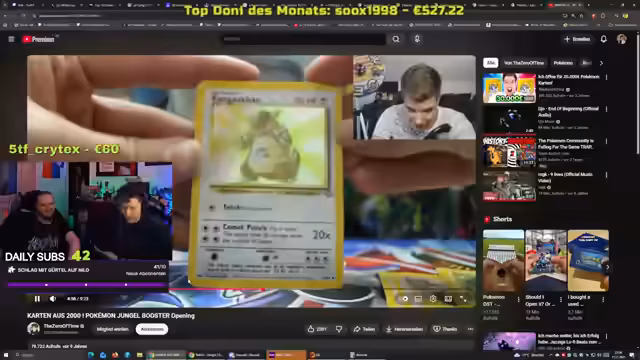 00:21:32Die Streamer diskutieren die Besonderheiten des neuen Pokémon-Sets und die damit verbundenen Risiken beim Öffnen von Boostern. Im Gegensatz zu Displays, die mindestens eine seltene Karte garantieren, können Booster-Packs aus Bundles und ETBs komplett leer sein. Ein Display kostet 240 Euro und selbst dann ist der Wert der gezogenen Karten oft geringer als der Kaufpreis. Es wird hervorgehoben, dass das Ziehen einer wertvollen Karte extrem unwahrscheinlich ist. Ein Zuschauer schlägt vor, 5-Minuten-Clips zu erstellen, was Nilo sehr begrüßen würde, besonders wenn diese auf einem Server gespeichert werden könnten. Es wird auch vor Fälschungen auf Flohmärkten und eBay gewarnt, da viele unechte Karten im Umlauf sind. Die Streamer betonen, wie wichtig es ist, sich auszukennen, um nicht betrogen zu werden. Im Anschluss wird eine kurze Unterhaltung über Cola-Sorten geführt, wobei Nilo seine Präferenz für Coca-Cola gegenüber 'Knabe-Cola' äußert. Die Spannung steigt, als sie sich auf das Öffnen der Booster vorbereiten, begleitet von Hintergrundmusik.