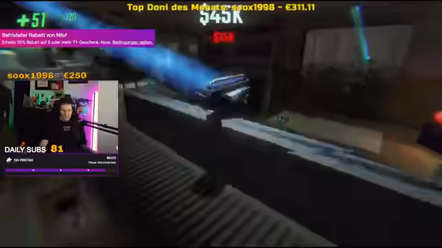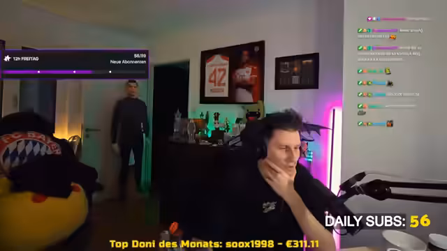 05:55:43Der Stream pflegte eine sehr direkte und humorvolle Interaktion mit seiner Community. Er kommentierte großspurig Spenden und Subs, insbesondere eine große Spende von 50 Euro durch einen Zuschauer namens Pascal, was er als schönes Gefühl beschrieb. Es gab laute und enthusiastische Reaktionen auf diese finanziellen Unterstützungen. Auch die Moderatoren im Chat wurden angesprochen und in den Stream einbezogen. Der Streamer rief die Zuschauer aktiv auf, bei Rabattaktionen zuzugreifen und motivierte sie durch laufe Ausdrücke und einlockende Angebote wie 35% Rabatt auf größere Sub-Pakete.