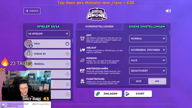 04:20:54Es wird über die Regeln eines Spiels diskutiert, bei dem sechs Personen teilnehmen müssen, bevor es startet. Unklarheiten bestehen bezüglich des Zeitlimits und ob das Spiel sofort endet, sobald die erforderliche Anzahl an Spielern erreicht ist. Es wird erwogen, ob die Teilnehmer während des Spiels miteinander kommunizieren sollen, da die meisten wahrscheinlich Steam im Hintergrund geöffnet haben. Ein Vorschlag ist, dass die Spieler sich melden, wenn sie fast fertig sind, um den Start des Zeichen- und Schreibprozesses zu koordinieren. Die Entscheidung, ob zuerst gezeichnet oder geschrieben werden soll, wird ebenfalls diskutiert. Es folgt eine kurze Überlegung zu den Begriffen, die gezeichnet werden sollen, wobei 'Rad' als möglicher Begriff in Betracht gezogen wird, obwohl die Meinungen darüber geteilt sind. Letztendlich wird beschlossen, die ursprüngliche Reihenfolge beizubehalten. Kurzzeitige Toilettenpause wird angekündigt, bevor es losgeht.
