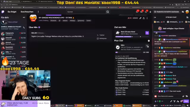 04:47:29Es wird über die hypergestörte Natur eines bevorstehenden Bildes spekuliert, basierend auf dem Satz 'Nilo versteckt sich im Gebüsch'. Man merkt sich den Satz in Verbindung mit dem aktuellen Bild, um die spätere Auflösung zu antizipieren. Die Community wird als 'krank' und 'gestört' bezeichnet, was auf eine gewisse Vorfreude auf den zu erwartenden Inhalt hindeutet. Es folgen einige Beispiele für abstruse Bildbeschreibungen, die im Chat kursieren, darunter ein Mann, der im FKK-Bereich in den Busch wichst, und Nele, die mit einem Kaktus um eine Pizza kämpft. Einige dieser Vorschläge scheinen nicht durchzukommen, während andere, wie Krütex, der für Kindergeld anschaffen geht, für Gesprächsstoff sorgen. Abschließend wird das Bild von Nilos bösem Zwilling, der den Stream übernehmen will, thematisiert, wobei spekuliert wird, wer diese Person darstellen könnte.