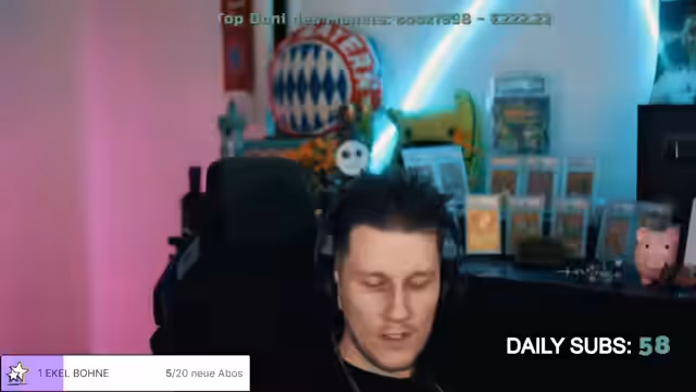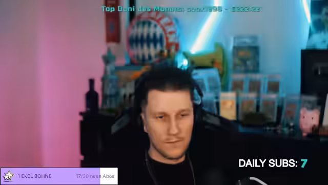 05:35:07Es wird eine spezielle Aktion angekündigt, bei der es eine "Ekelbohne" für 15 Subs gibt. Der Streamer scherzt darüber, dass er vorhin schon erbrochenes hatte. Er fordert die Zuschauer auf, sich etwas Neues für den nächsten Pot einfallen zu lassen und nimmt Bezug auf Kritik an Darko. Es werden Namen von Zuschauern genannt, die im Stream aktiv sind. Der Streamer erwähnt, dass er bald schlafen gehen muss, da er früh aufstehen muss. Es wird spekuliert, wer den Stream verlassen hat. Der Streamer bittet Fanti, im Stream zu bleiben und droht, ihn alle 15 Minuten zu fragen, ob er noch da ist. Er überlegt, was er als Nächstes tun soll und bittet die Zuschauer um Inspiration. Der Chat schlägt "Matrose" vor, woraufhin der Streamer andeutet, sich anpassen zu müssen. Er bedankt sich für den Support und erwähnt, dass er sich selbst eine Gratik angekauft hat. Es wird über die Kosten von Bits diskutiert und der Streamer rechnet vor, wie viele Bits 20 Euro entsprechen.