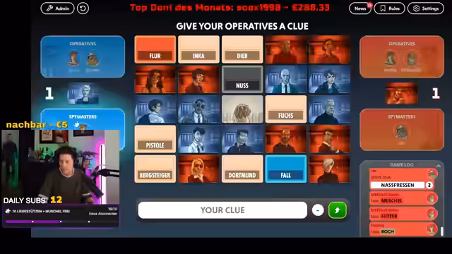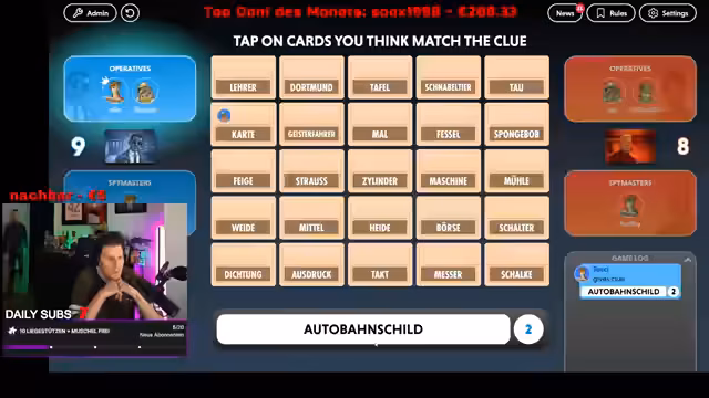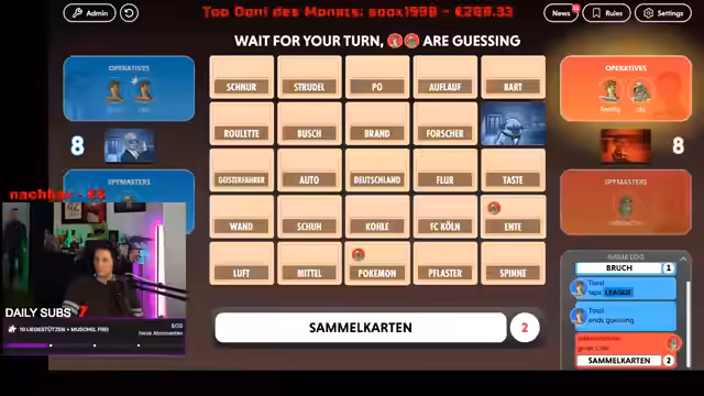 03:15:17Die Vorbereitung für das Spiel Codenames ist im Gange. Der Streamer bittet die Community, neue Wörter für das Spiel beizusteuern, um es abwechslungsreicher zu machen. Es werden bereits vorgeschlagene Wörter wie RB Leipzig, FC Bayern, Pokémon, World of Warcraft, Spongebob, Dortmund, FC Köln, Geisterfahrer und endoplasmatisches Reticulum genannt. Der Streamer merkt an, dass einige Wörter, wie das endoplasmatische Reticulum, nicht alle kennen, was das Spiel schwieriger macht.