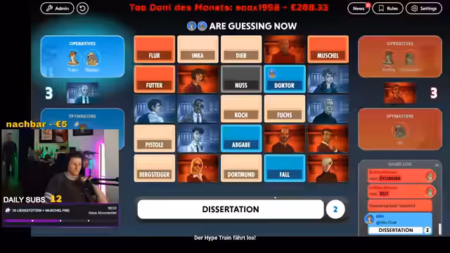 03:31:24Es wird eine eingehende Analyse von möglichen Antworten in einem Wortspiel oder Ratespiel betrieben. Der Streamer und sein Team tauschen sich über die Ausschlusslogik und die Verknüpfung von Begriffen wie 'Tafel', 'Karte', 'Geisterfahrer' und 'Schalter' aus. Ziel ist es, die wahrscheinlichsten Kandidaten für die Lösung zu identifizieren, wobei persönliche Vorlieben und logische Schlüsse eine wichtige Rolle spielen. Der Prozess wird wiederholt, um die optimale Auswahl zu treffen.