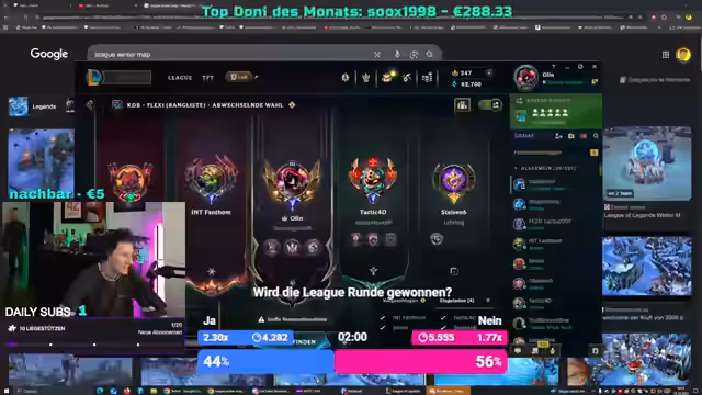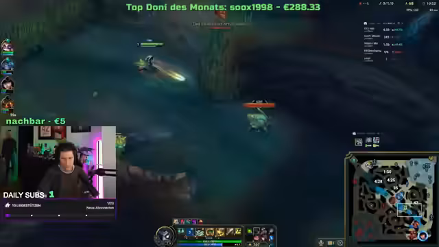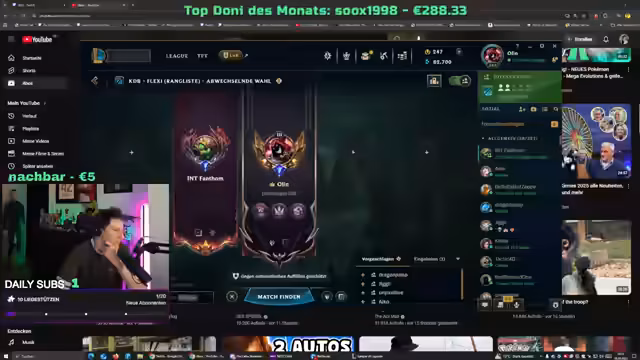 01:22:09Ein Teil des Streams widmet sich dem Live-Spiel von League of Legends. Der Streamer agiert als Amumu im Jungle. Dabei kommt es zu mehreren koordinativen Problemen im Team. Es gibt Konfusion bei Teamfights, unklare Bewegungen und eine mangelnde Kommunikation. Dies führt zu verpassten Chancen, wie zum Beispiel dem Fang eines Drakes oder dem Verhindern von gegnerischen Ultimativen. Der Streamer analysiert die gespielten Szenen im Nachhinein und gibt Feedback, um zukünftige Fehler zu vermeiden. Das Gameplay zeigt sowohl Momente starker Teamkombis als auch kritische Fehler bei der Koordination.