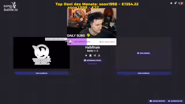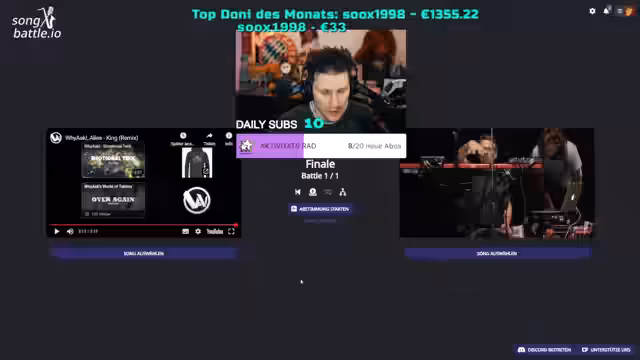 00:00:45Der Streamer startet ein interaktives Song-Battle. Die Zuschauer entscheiden durch Abstimmung im Chat, welcher von zwei konkurrierenden Songs weiterkommt. Es geht um Viertelfinale-Battles, bei denen Songs wie Sahide gegen King gegeneinander antreten. Der Streamer ermutigt die Zuschauer, aktiv mit Abstimmungen teilzunehmen, um den Verlauf zu beeinflussen und spannende Duelle zu erleben.