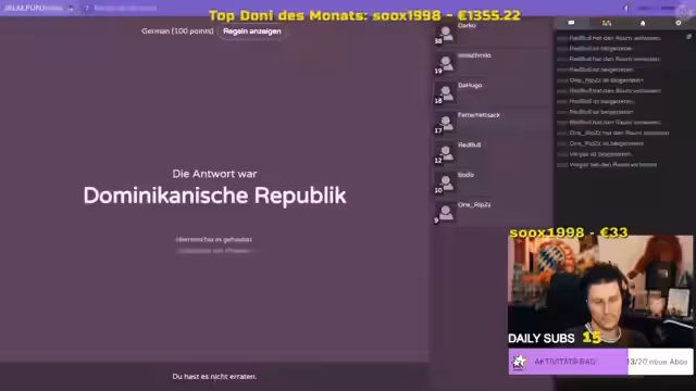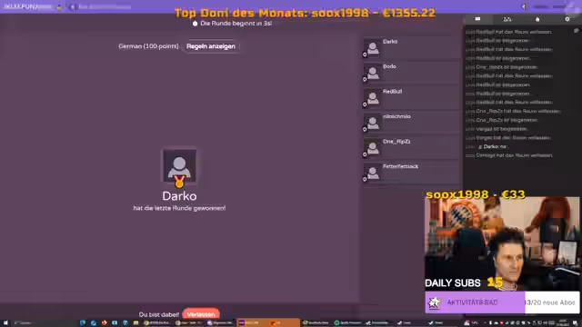 01:10:23Das Ratespiel wird fortgesetzt. Darko zeigt erneut seine beeindruckenden Fähigkeiten, indem er viele richtige Antworten gibt und dabei schneller ist als der Streamer. Die Runde ist von viel Wettbewerb und anerkennenden Kommentaren geprägt. Darko wird als unbesiegbarer Spieler im Ratespiel bezeichnet.
