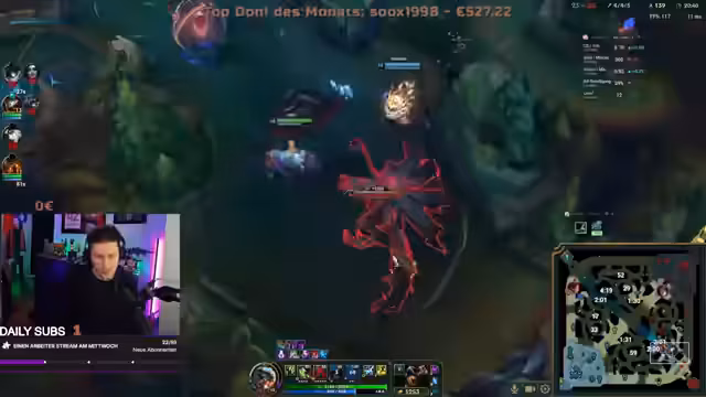 01:48:55Das Team kämpft weiterhin in einem intensiven League of Legends Match, wobei die Überlegenheit des gegnerischen Brands, der bereits 3-1 steht, deutlich wird und erheblichen Schaden verursacht. Es herrscht Frustration über die Spielweise des Gegners, insbesondere nach einem Tower-Dive, bei dem der Amumu des eigenen Teams stirbt, weil der Gegner nicht getower-dived hat. Die strategischen Entscheidungen der Gegner werden hinterfragt, da sie trotz eines 4-Mann-Ganks unten auf der Karte nur wenig Vorteil erzielen und stattdessen Material verlieren. Diese Situation führt zu wachsender Wut und dem Gefühl, dass das Spiel unfair verläuft, da der gegnerische Brand als 'geisteskrank' übermächtig beschrieben wird und die Mid- und Toplane bereits T2-Tower verloren haben.