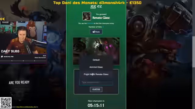 00:23:01Es folgt ein Quiz über League of Legends Champions. Der Streamer gibt Hinweise zu bestimmten Fähigkeiten und Eigenschaften der Champions. Zuerst raten die Zuschauer 'Vayne', danach kämpfen sie sich durch verschiedene Champions und Fähigkeiten. Als weitere Champions werden 'Kassadin' und 'Kled' identifiziert. Das Quiz zeigt die tiefgehende Kenntnis des Streamers und der Community über die Champions.