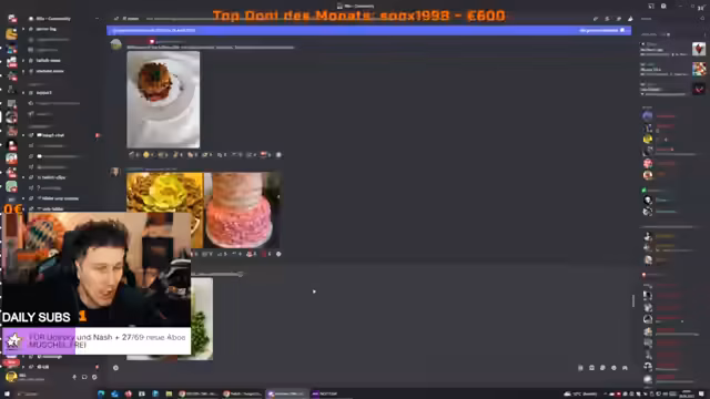 00:41:40Der Streamer bittet die Chat-Teilnehmer, Bilder ihrer Ostergeschenke in den Geschenke-Channel des Discord zu stellen, auch wenn es sich nur um kleine Dinge wie einen Schoko-Osterhasen handeln sollte. Er beginnt, die eingehenden Bilder mit Begeisterung zu kommentieren, darunter diverse Snacks, Figuren wie Labubus, Sondereditionen und kulinarische Kreationen. Es entsteht eine interaktive und gemeinschaftliche Stimmung im Chat.