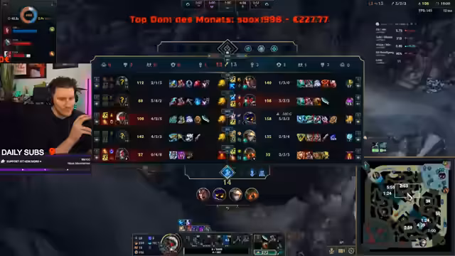 05:40:45Nach einer intensiven Spielphase lenkt der Streamer das Thema auf aktuelle gesellschaftliche Diskussionen über Generationen wie Gen Alpha und den drohenden Gen Beta. Er nutzt dies als humorvolle Ablenkung. Anschließend widmet er sich wieder dem Spiel, wobei er sich auf seine beeindruckende Kill-Serie und die effektive Nutzung von ultimativen Fähigkeiten konzentriert. Er lobt das Team für die koordinierte Eroberung von wichtigen Objekten wie Drakes und Herold, die zu einer dominanten Position im Spiel führen, auch wenn einige Teamkämpfe knapp und unvorhersehbar verlaufen.