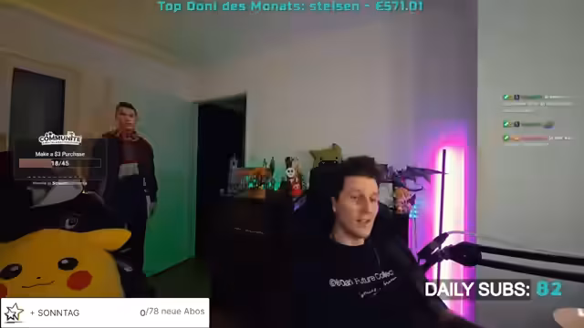 01:38:48Axel spendet 5 Submarinos, worauf der Streamer dem Volk-Chat für die Unterstützung dankt und zu weiterem Sub-Hype aufruft. Es wird erwähnt, dass ein Song Quest von Anna, Dark und drei weiteren Personen gewünscht wurde, der Streamer jedoch stattdessen seinen eigenen Song 'Reisen' spielt, um die vielen unterschiedlichen Song Requests zu verdeutlichen. Gleichzeitig appelliert der Streamer, immer wieder Unterstützung für das Stream zu zeigen, da das Streaming Kosten verursacht, und warnt, dass bei zu geringer finanzielle Unterstützung das Stream unvermeidlich enden wird.