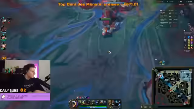 00:47:52Nach dem Einkaufsbummel wechselt der Streamer zu League of Legends. Er spielt den Champion Nautilus in der Bot-Lane und ist sichtlich begeistert von seinem Spiel, insbesondere nach einem sehr erfolgreichen Teamfight. Er hat eine positive Kill-Death-Assist-Bilanz und trägt maßgeblich zum Sieg des Spiels bei. Nach dem Match, das er mit einer Bewertung von S abschließt, kündigt er an, Story & Quests anzunehmen, was die Zuschauer umsetzen können.