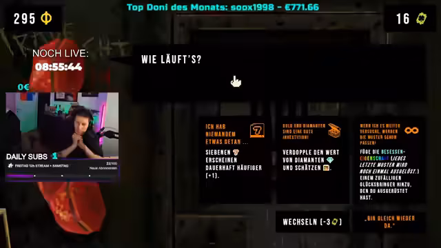 02:40:37Der Streamer taucht in ein Glücksspiel-Minispiel ein, das als 'Gamba' bezeichnet wird. Die Regeln des Spiels, das Einzahlen von Münzen, das Verdienen von Zinsen und das Nutzen von Klee-Tickets für Glücksbringer werden erklärt. Die Spannung steigt, während der Streamer versucht, hohe Gewinne am Spielautomaten zu erzielen. Trotz einiger Rückschläge und der Einführung einer '666'-Regel, die zum Verlust des gesamten Gewinns führen kann, gelingt es dem Streamer, beeindruckende Gewinne zu erzielen, darunter ein 'Vollbild 7er' im Wert von 28.500 Euro. Die Glückssträhne hält an, und es werden weitere hohe Gewinne erzielt, was zu großer Begeisterung führt. Die Interaktion mit den Zuschauern und die Diskussion über die Spielmechaniken tragen zur Unterhaltung bei.